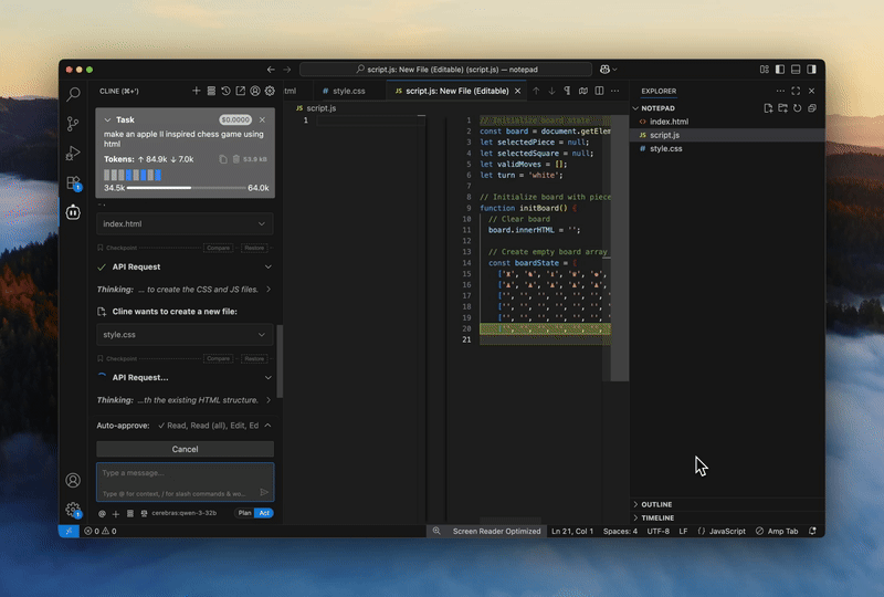 Use Cerebras Code Pro with any AI-friendly editor or agent that accepts your API key. Works out of the box with Cline, RooCode, OpenCode, Crush, and more. Integrate instantly and code without switching tools.
