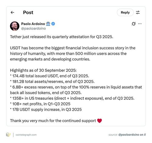 Its latest attestation shows $181.2 billion in reserves against $174.5 billion in liabilities, leaving $6.8 billion in excess and more than $174 billion in USDt in circulation. With interest rates high, that Treasury-heavy portfolio has generated over $10 billion in profit so far in 2025, a figure more typical of a financial institution than a crypto startup.
