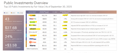 Softbank has traded as an OpenAI proxy over the summer (similarly to how it traded pre BABA listing) with a discount to NAV sharply shrinking (-14% using the company's assumption post close marking to market their Open AI stake at latest round of valuations at $500B vs the $260B they participated in at earlier this year – model available on request). Post its recapitalisation, Softbank via its SVF2 has now a 11% stake in OpenAI Group PBC ($34.7B investment). They have completed their first tranche and set to proceed with the second and large tranche ($22.5B in Dec. this year)