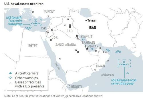Here’s a map, via the Wall Street Journal, showing the approximate positions of U.S. bases and naval assets in theater: