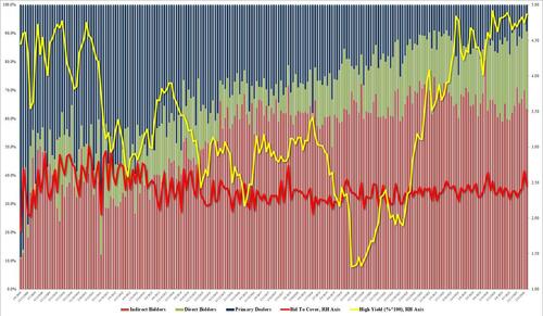 Overall, this was a solid if not stellar 30Y auction, which considering the mauling the long-end has been subjected to - note the 10Y is now trading at 4.24%, up sharply from 3.97% two weeks ago - it was a very respectable result.