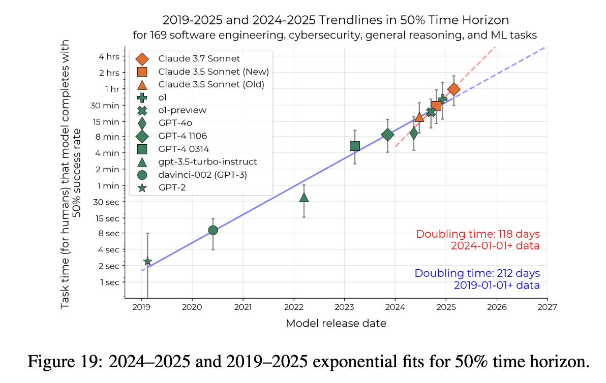 Most notably, p37 of the “Long Tasks” paper shows that if you look at the trend solely over 2024-2025 (GPT4o launch to Claude 3.7 Sonnet launch), then the doubling time is about twice as fast (118 days instead of 212)! This could get to one-month tasks by September 2027!