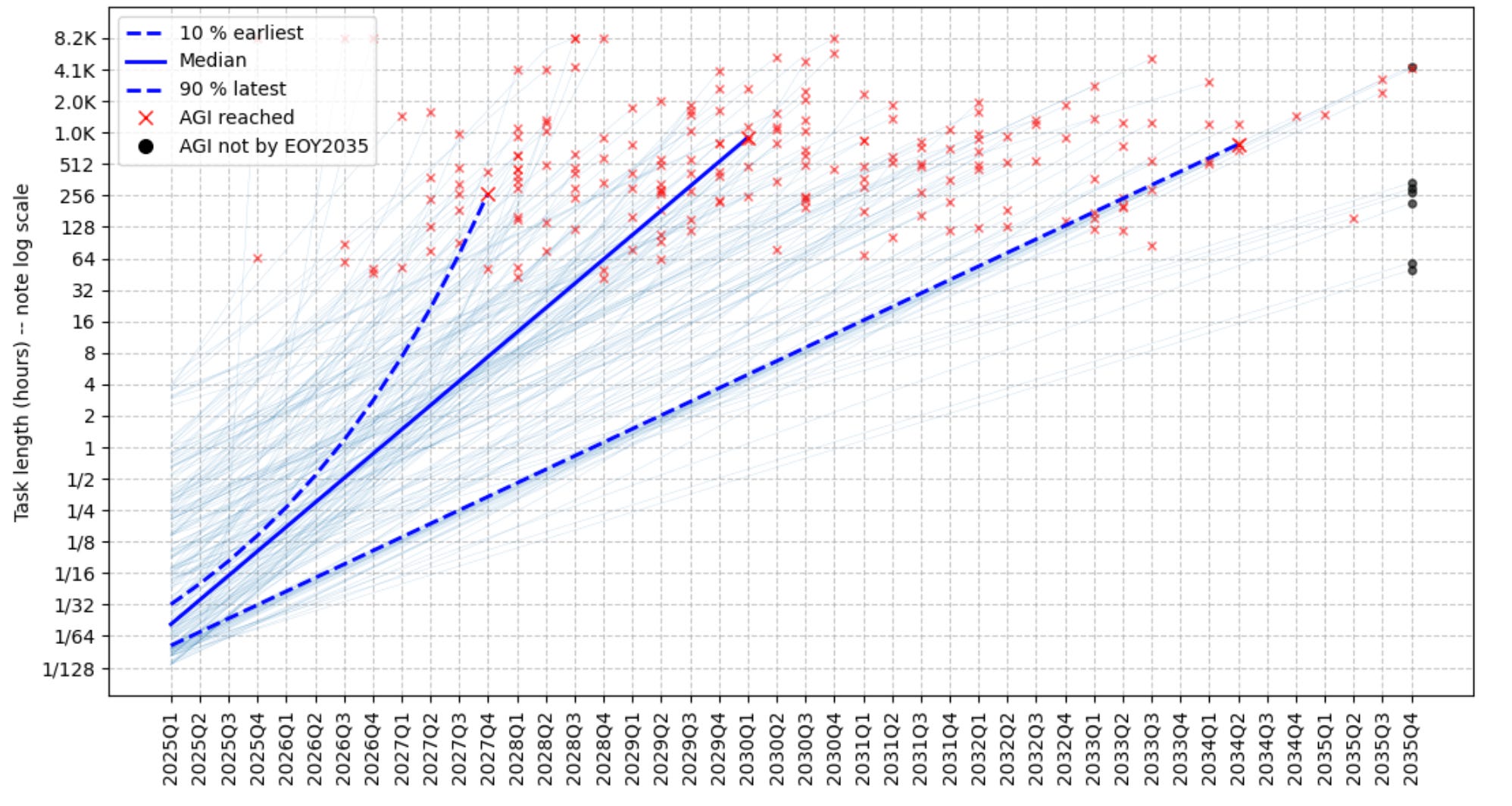 We then try to figure out what level of “task length at 50% reliability” it takes to be equivalent to AGI, see when the trendline thinks we will hit that mark, and declare that to be the date of AGI.