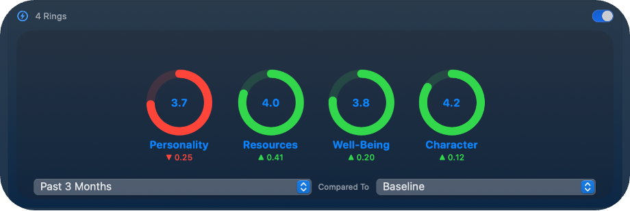 When you first use the coach, you answer a baseline survey of the four constructs, so that Dlog knows where you have been over the past year. As you journal and work on projects, your entries are scored against the same baseline survey so that you can see if you are above or below your norm in any of the four rings.
