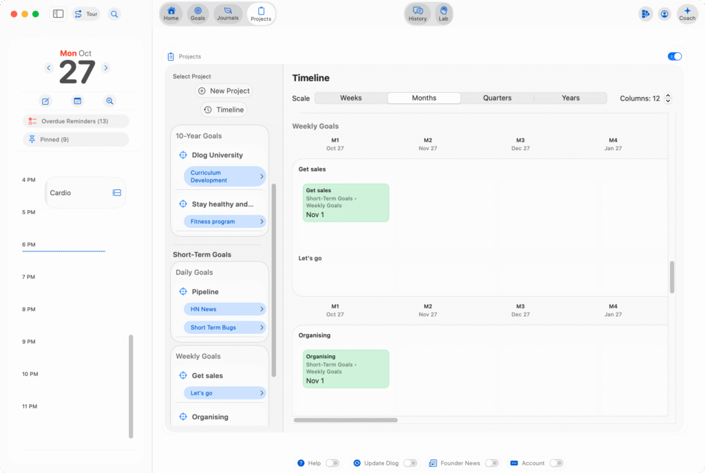 Dlog puts all your productivity tools into one place. Integrating goals, projects, journals and reminders into your calandar.