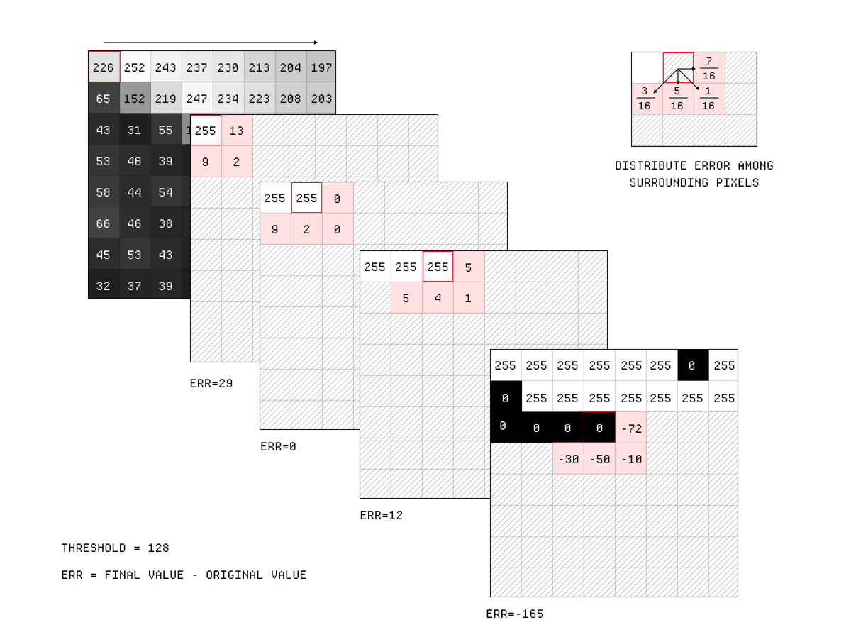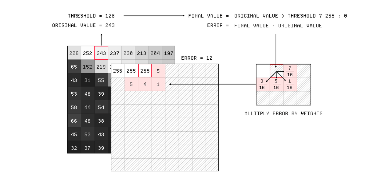 This time, we take the difference between the original value and our new value and apply that difference, known as the error, to surrounding pixels.