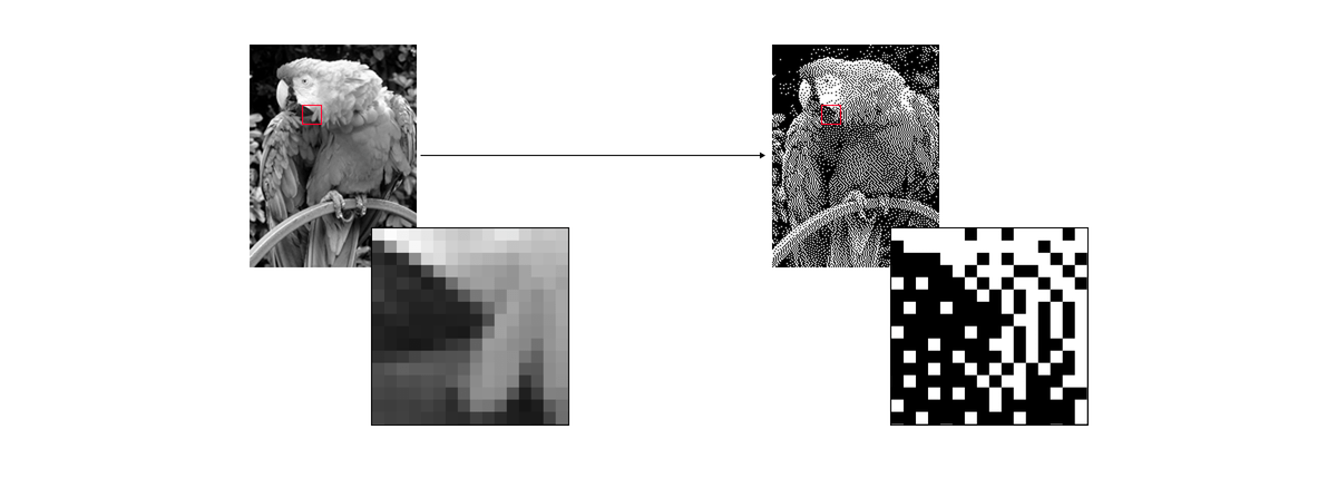 For the sake of simplicity lets use a monochrome image. Our goal is to recreate the grey tones in the image using just black and white.