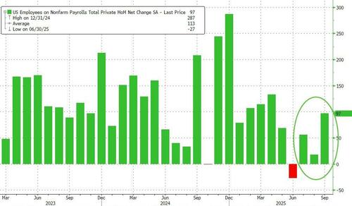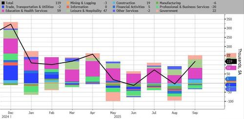 We also said that if today's jobs number is atrocious, the Fed would once again be viewed as being behind the curve. So perhaps working in conjunction with the newly returned BLS employees, the outgoing Fed chair snuck in a pointer or two, and in an attempt to avert allegations of blowing up the economy, moments ago the BLS reported that the (delayed) September number came in a stronger than all estimates 119k jobs...